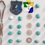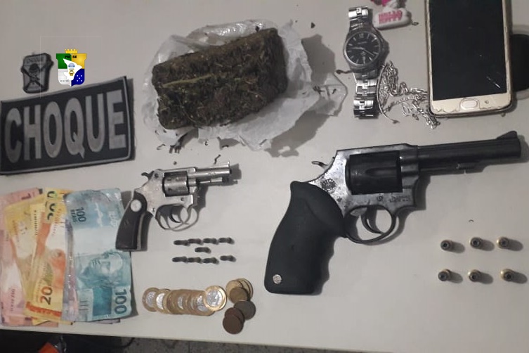Após buscas pessoais e no interior do veículo, os policiais encontraram um revólver calibre .38 com seis munições intactas, um revólver calibre .32 com nove munições, além de uma mochila contendo aproximadamente 1165 gramas de maconha, 468,30 reais em dinheiro e dois aparelhos celulares