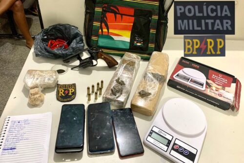 Eles foram autorizados a entrar no imóvel por uma mulher que estava no local, e apreenderam um bornal contendo 1,6 quilos de maconha, 207 gramas de crack, um revólver calibre .38, com sete munições; além de uma balança de precisão, pinos vazios e anotações referentes ao tráfico.