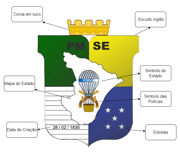 Descrição heráldica – Escudo inglês, palado, estilizado, tendo como ornato exterior uma coroa em ouro, representando o Império do Brasil. Partição esquartelado, com subpartições cujas cores representam a Bandeira do Estado de Sergipe. Encimando o ângulo do meio do Chefe, encontram-se peças representativas da sigla da Polícia Militar do Estado de Sergipe (PMSE).