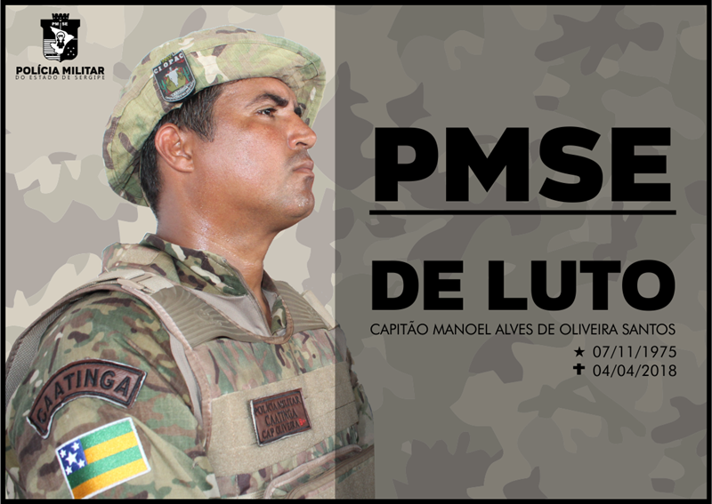 5 de abril de 2018Enlutado pela perda irreparável do capitão Manoel Alves de Oliveira Santos, comandante da Companhia Independente de Operações Policiais em Área de Caatinga (Ciopac), o comando da Polícia Militar do Estado de Sergipe informa que o corpo do oficial será velado inicialmente no Centro de Formação e Aperfeiçoamento de Praças (Cfap), situado na Rua Argentina, s/nº, no Bairro América, na cidade de Aracaju.