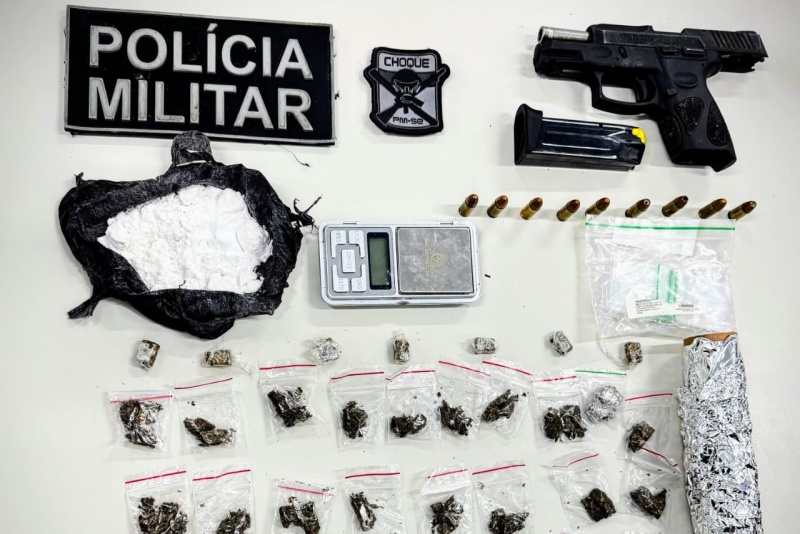 Sob posse do envolvido, o BPChoque encontrou uma pistola Taurus com a numeração suprimida, nove munições no carregador, cocaína, maconha, uma balança de precisão, rolo de papel alumínio, e embalagens de Ziplock.