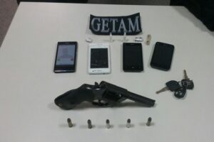O trio suspeito estava no veículo Corsa, de cor prata e placas HZQ-9315. Diante da cena, a guarnição Escorpião 51 abordou o grupo, e, durante revista veicular, encontrou um revólver calibre 38, com numeração raspada, quatro munições intactas e uma picotada.