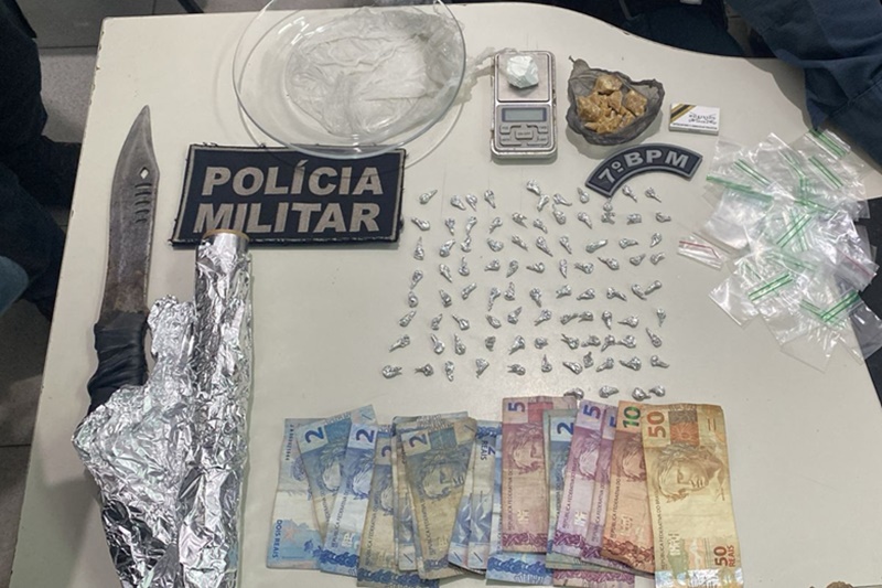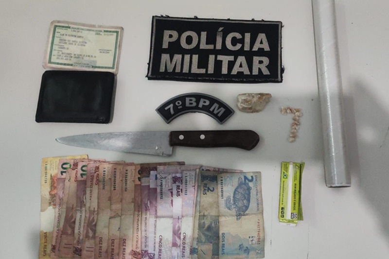 Por volta das 13hs, a guarnição realizava rondas na Rua José Vieira Filho, quando visualizou um motociclista, numa moto vermelha, conversando com um homem. Ao perceber a aproximação da viatura, o motociclista evadiu-se e o outro suspeito, que portava uma mochila infantil azul, arremessou-a para dentro de sua residência. A equipe realizou uma abordagem e encontrou com ele papelotes de craque. Na bolsa, foram encontrados aproximadamente sete gramas de cocaína; 90 papelotes de craque, além de outras pedras maiores, totalizando 32 gramas. Foram encontrados ainda R$112,00 em dinheiro; uma faca tipo peixeira; uma balança de precisão; papel alumínio e diversos papelotes para embalagem dos entorpecentes.