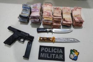 No momento da abordagem e da revista veicular, os militares encontraram uma pistola calibre 9 milímetros, carregada com 17 munições, além de duas facas e um montante em dinheiro que totalizou quase R$ 16.000,00.
