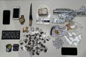 Os suspeitos foram flagrados com 25 gramas de cocaína, 50 gramas de crack, 260 gramas de maconha e uma balança de precisão, além de material para embalar as drogas.