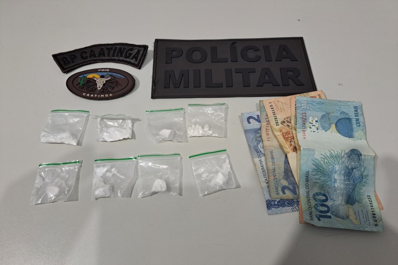 Momentos depois, foi encontrado um papelote de substância análoga a cocaína no interior do carro. Diante da suspeita, foi realizada busca pessoal no condutor onde foram encontradas sete pequenas embalagens contendo mais quantidades da droga. Ainda em posse do suspeito foi localizado a quantia de 204,00 reais.