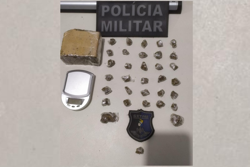 Os militares estavam em patrulhamento na região quando visualizaram um homem sentado em frente a uma residência que, ao perceber a presença da guarnição tentou fugir, mas foi interceptado. Com ele foi encontrado um papelote de maconha. No jardim da residência a equipe encontrou um vaso de vidro com 32 papelotes, um tablete de maconha pesando aproximadamente 214g e uma balança de precisão.