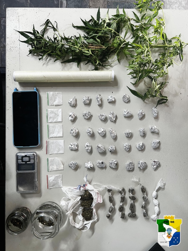 Durante a abordagem, foram apreendidas 25 embalagens de alumínio contendo maconha e 10 invólucros de cocaína.