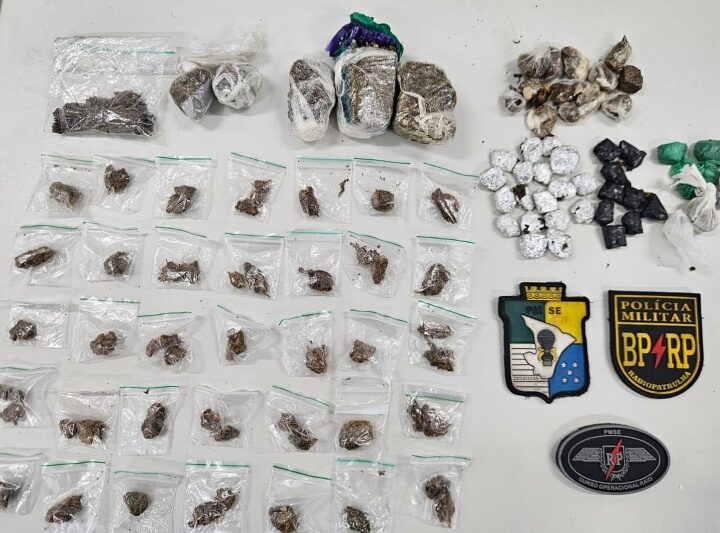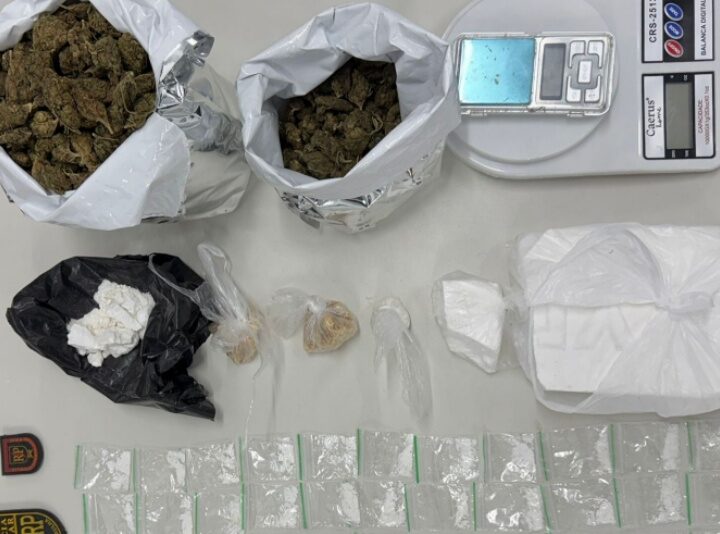 Durante a abordagem, foi encontrado um revólver calibre 38 com quatro munições intactas, 13g de cocaína, embalagens tipo “ziplock”, uma balança de precisão, uma faca grande e dois celulares.