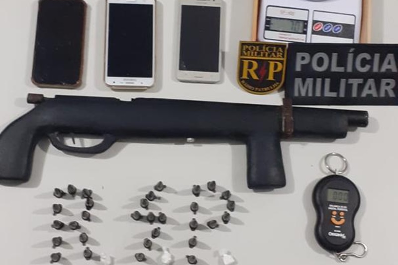 Diante das evidências, os militares realizaram uma varredura minuciosa no local, que resultou nas apreensões de 60 gramas de cocaína, divididas em pinos e trouxas, duas balanças de precisão, seis celulares e uma espingarda calibre 12.