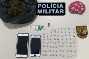 Em seguida, o veículo foi revistado e a equipe do BPRp apreendeu mais cápsulas com cocaína, pedras de crack e uma munição calibre 380, além da sacola arremessada que continha maconha.