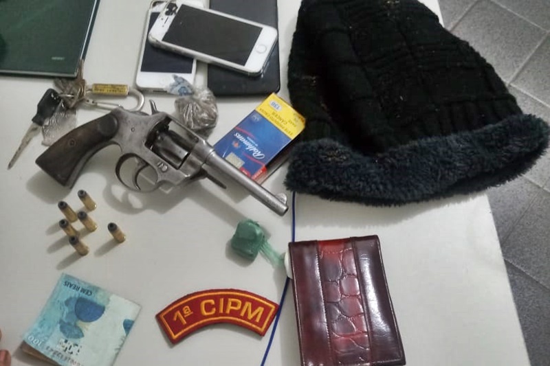 Após várias diligências na região, os policiais localizaram os suspeitos. Na abordagem, foram encontrados um revólver calibre .32 , seis munições, duas motocicletas Bros sem placas, além de três aparelhos celulares, um capuz, uma pequena quantidade de maconha e R$ 195,00.