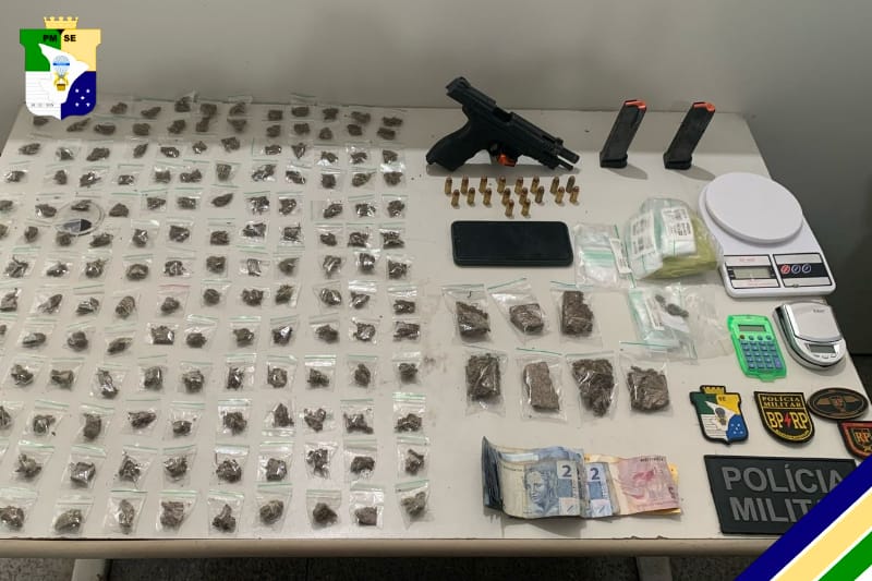 Durante a abordagem, os militares encontraram com ele uma pistola Taurus, calibre .40, com três carregadores e 18 munições, além de 350g de maconha embaladas em “ziplocks” para comercialização, duas balanças de precisão, anotações da contabilidade do tráfico e a quantia de R$ 63,00 em dinheiro.