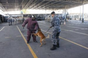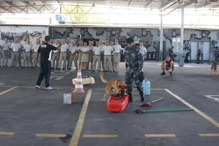 Dando sequência às atividades, foi a vez do comandante da 1ªCia/BPChq, capitão J. Nascimento, expor à comitiva da Bahia os equipamentos de uso individual e coletivo, bem como o armamento e munições utilizados pelo efetivo do BPChq/SE. Por fim, a tropa assistiu à apresentação do comandante da 3ªCia/BPChq, capitão Moraes, que demonstrou na prática a ação dos cães nas modalidades de faro (detecção de drogas) e de defesa do policial militar, instrução reforçada pelo cabo Élvio.