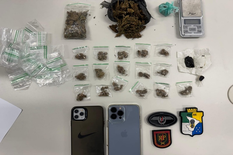 Ao todo, foram apreendidos 50g de maconha fracionada, 4g de haxixe, dois aparelhos celulares, uma balança de precisão, sacos plásticos tipo “zip lock” e um rolo de papel manteiga.