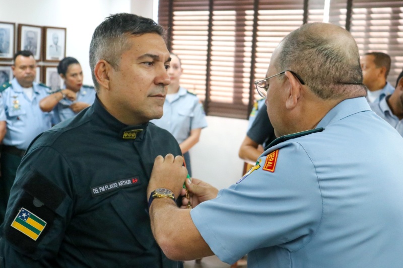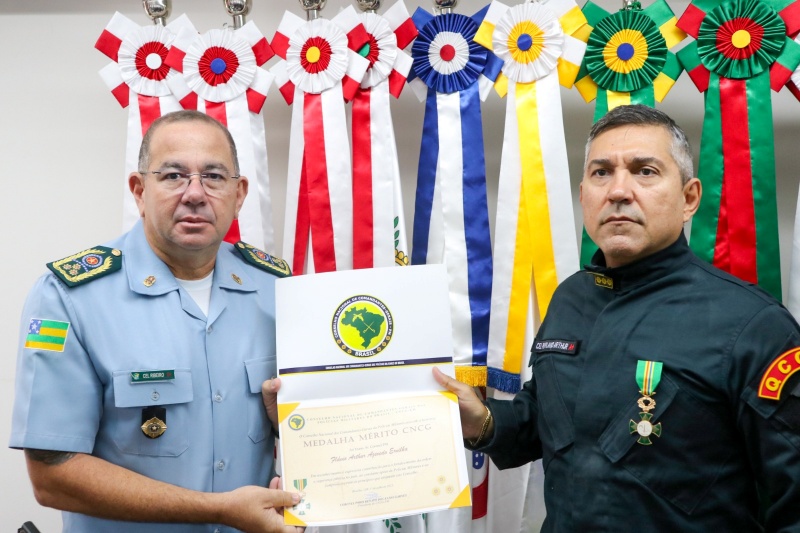 A primeira homenagem da manhã foi a entrega da Medalha Mérito CNCG ao Coronel Flávio Arthur Azevedo Ervilha, agraciado por delegação do Comando Nacional das Corporações Guardiãs. A honraria foi entregue pelo Comandante-geral da PMSE, Coronel Alexsandro Ribeiro de Souza.