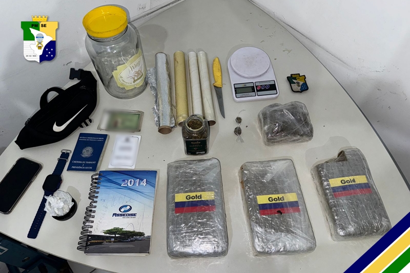 Na casa, os policiais encontraram mais droga, uma balança de precisão, uma faca, rolos de papel filme e alumínio e um caderno com anotações referentes ao comércio ilícito de entorpecentes.