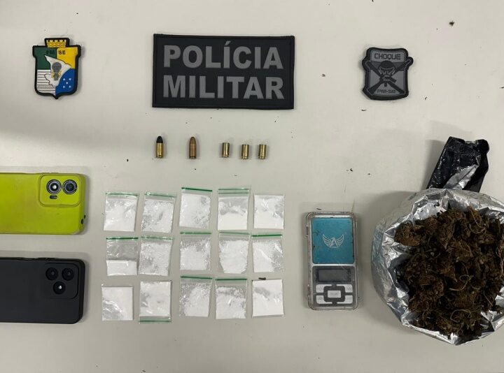 Durante a abordagem, o BPChoque encontrou maconha, crack, embalagens para acondicionamento de drogas, e três munições calibre. 38.