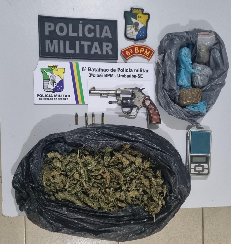 Diante das informações, os policiais seguiram para o endereço indicado e conseguiram localizar dois infratores com as características repassadas. Durante a abordagem e busca pessoal, foi constatado que um deles estava portando um revólver municiado e uma porção de maconha. Com o outro suspeito foi encontrada uma balança de precisão e uma porção de maconha em uma bolsa plástica.