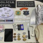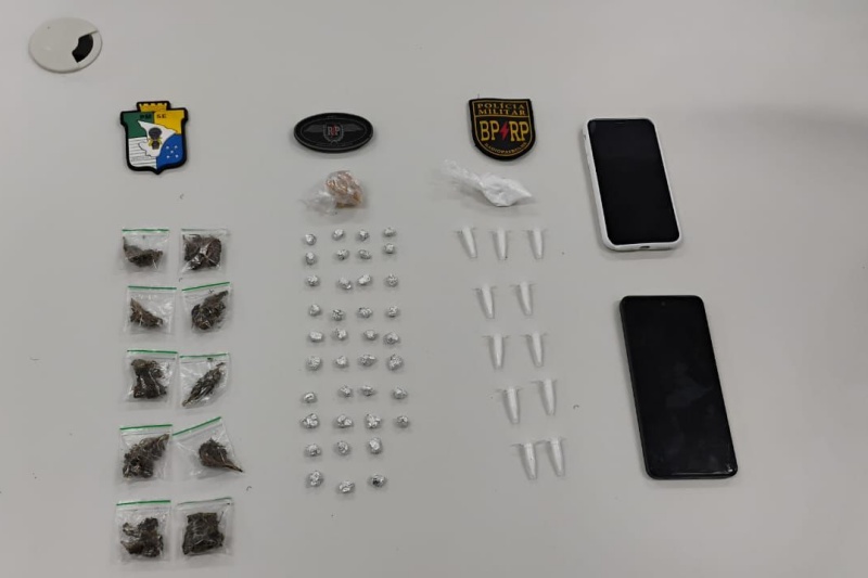 Na abordagem, realizada por uma policial feminina, as suspeitas foram flagradas com 61 porções de entorpecentes, sendo 38 pedrinhas de crack embaladas e uma em estado bruto, 11 pinos e uma trouxinha contendo cocaína, além de 10 saquinhos plásticos do tipo zip lock com maconha.