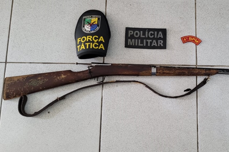 Em decorrência das informações recebidas e com a autorização da mulher, os policiais adentraram à residência e encontraram uma espingarda carregada e de calibre não identificado.