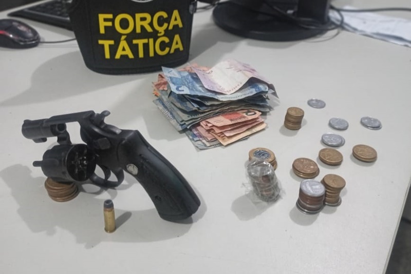Durante o patrulhamento os policiais foram informados pelo Ciosp de que havia um homem armado nas imediações da Rua 32. O suspeito foi identificado e tentou se livrar do flagrante arremessando a arma de fogo por cima do muro de uma residência. Durante as buscas, os policiais conseguiram apreender a arma, um revólver calibre .38 carregado com uma munição intacta, além de maconha cocaína e dinheiro.
