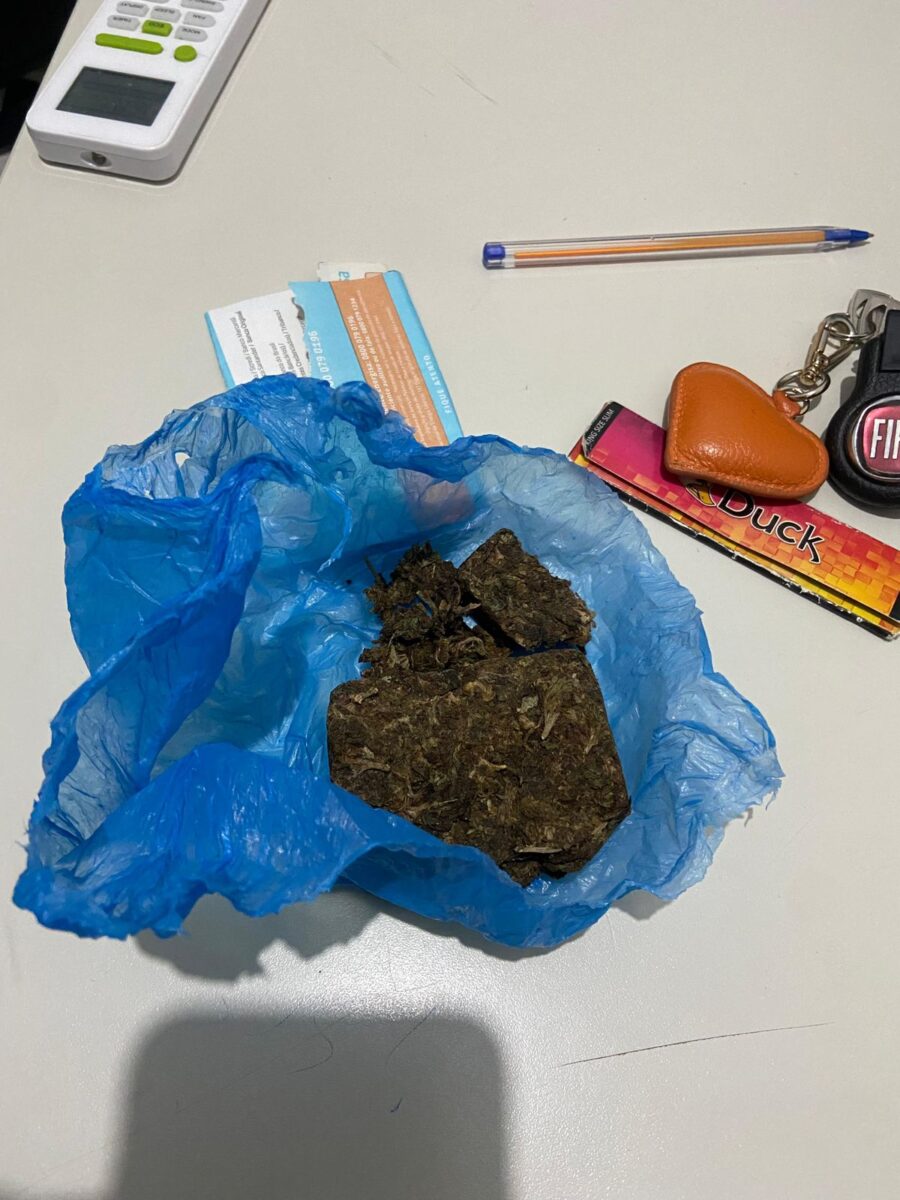 Ao acompanhá-lo, os militares o flagraram tentando se desfazer de uma sacola azul. Durante a revista, foi encontrada uma porção de maconha, pesando aproximadamente 96 gramas.