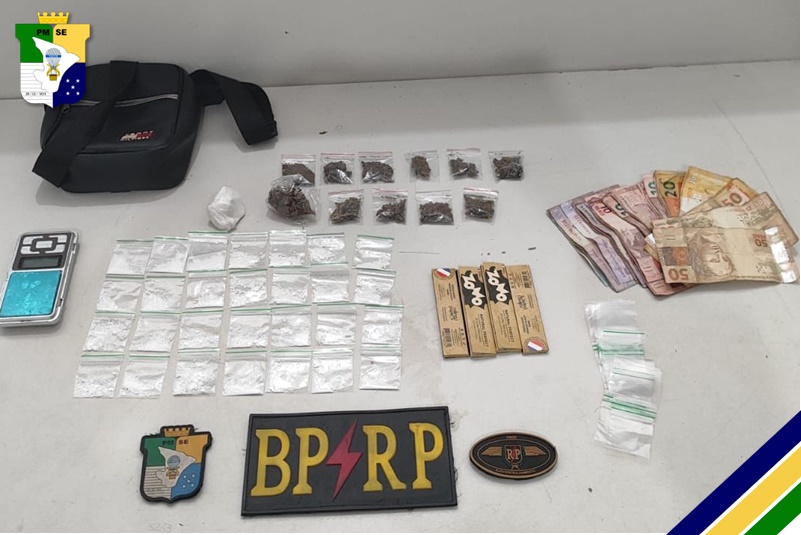 Em decorrência do comportamento, os militares realizaram a busca pessoal, e sob sua posse foram encontradas 28 embalagens com cocaína, além de uma pedra da mesma substância, e 11 pacotes com maconha. Com o rapaz também foi achado R$ 910,00 reais em espécie, que segundo o rapaz, era o pagamento dos entorpecentes apreendidos e uma balança.