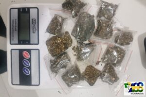 No momento em que a PM entrou, um dos presentes fugiu pelos fundos, não sendo possível a identificação. Durante a abordagem foi encontrada uma bolsa contendo 13 buchas de maconha, em cima de uma cama.
