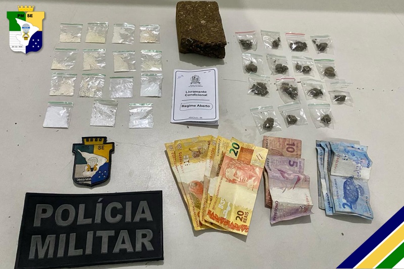 Durante patrulhamento, os policiais abordaram um homem que estava portando 5 gramas de substância análoga à cocaína e R$131. Além disso, na residência do suspeito, foram encontrados 300 gramas de substância análoga à maconha.