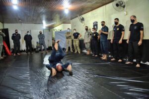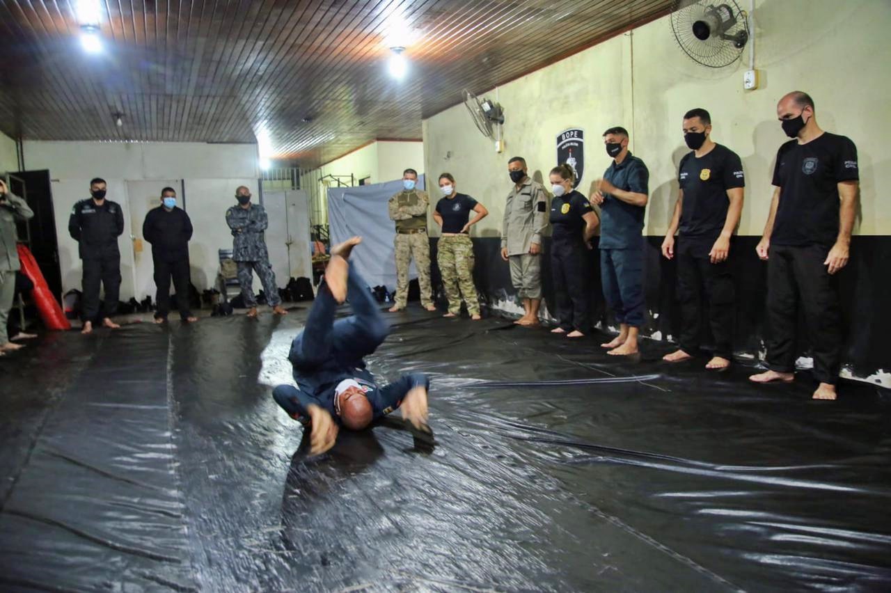 Direto da capital do Acre, o sargento Élvio, falou sobre o curso. “O nosso objetivo é garantir que os policiais aqui treinados recebam uma formação de excelência em técnicas especiais de defesa pessoal, algemação policial, imobilização tática, uso progressivo da força, condução, retenção e contra retenção de armas, entre outras. Dessa forma, até o próximo sábado vamos compartilhar toda a nossa experiência na área e contribuir, juntamente com o capitão Gustavo Craveiro, da PM do Rio Grande do Norte, para a capacitação dos alunos.”