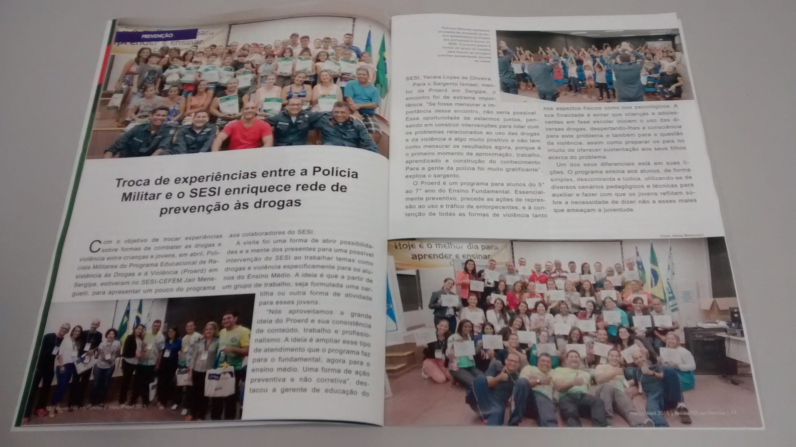 O texto ressaltou a visita feita pelo PROERD ao SESI-CEFEM Jair Meneguelli, na capital sergipana, bem como o objetivo do encontro: “abrir possibilidades e a mente dos presentes para uma possível intervenção do SESI ao trabalhar temas como drogas e violência especificamente para os alunos do Ensino Médio”. As duas páginas da matéria estamparam fotos que retratam o envolvimento das duas Instituições durante as atividades dirigidas aos profissionais e alunos.